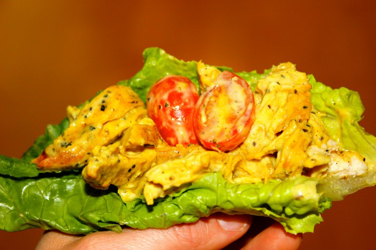 Roast chicken at 400F for 25-30 mins, until cooked through. Shred with two forks and set aside. In food processor, combine remaining ingredients (except for romaine/endive). Adjust seasoning to desired taste (adding more Dijon, garlic, pepper or salt). Pour sauce over shredded chicken and mix until well combine. Spoon chicken Caesar mixture into romaine or endive leaves.