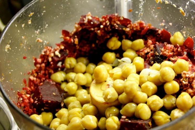 Roast beets and garlic in tinfoil packages for at least 1 hour. Let cool. In food processor, combine beets and garlic. Add chickpeas and white wine vinegar and combine. Add parsley and blend again. Add salt and pepper to taste. Add water as needed until desired consistency is reached.