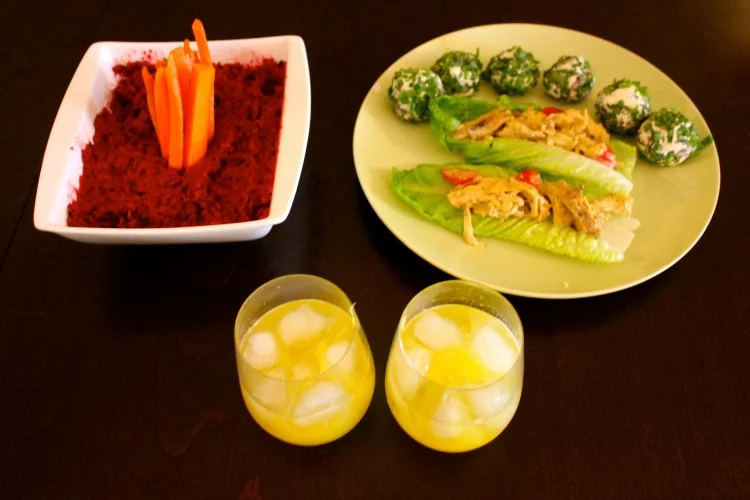 On the menu: Caesar salad bites, herbed mushroom goats cheese balls, beet romesco dip, and a pineapple-lime cocktail to wash it all down!