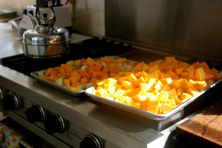 Peel and cut butternut squash and onions into 2 inch cubes. Place on baking sheets with olive oil and mix together with hands. Bake for 35 – 45 minutes or until veggies are completely cooked through.