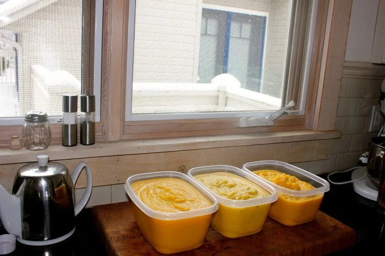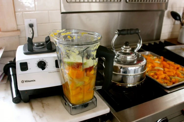 Using a vitamix, blender or food processor take half the veggies and 1-2 cups of chicken stock and mix together with 2 sliced apples. Then repeat with the other half.